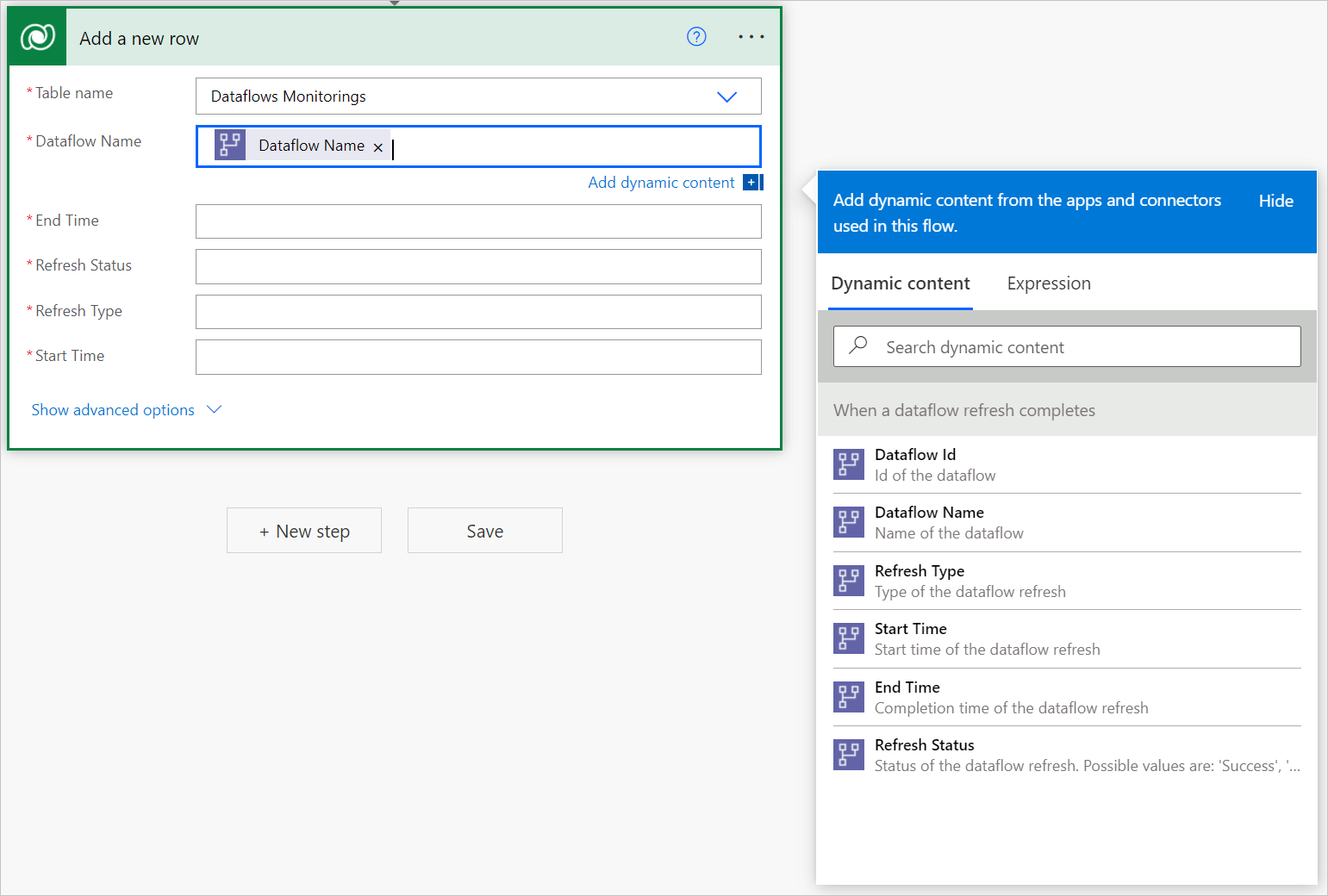 In Add a new row, select Choose a table and then choose Dataflows Monitoring from the list.