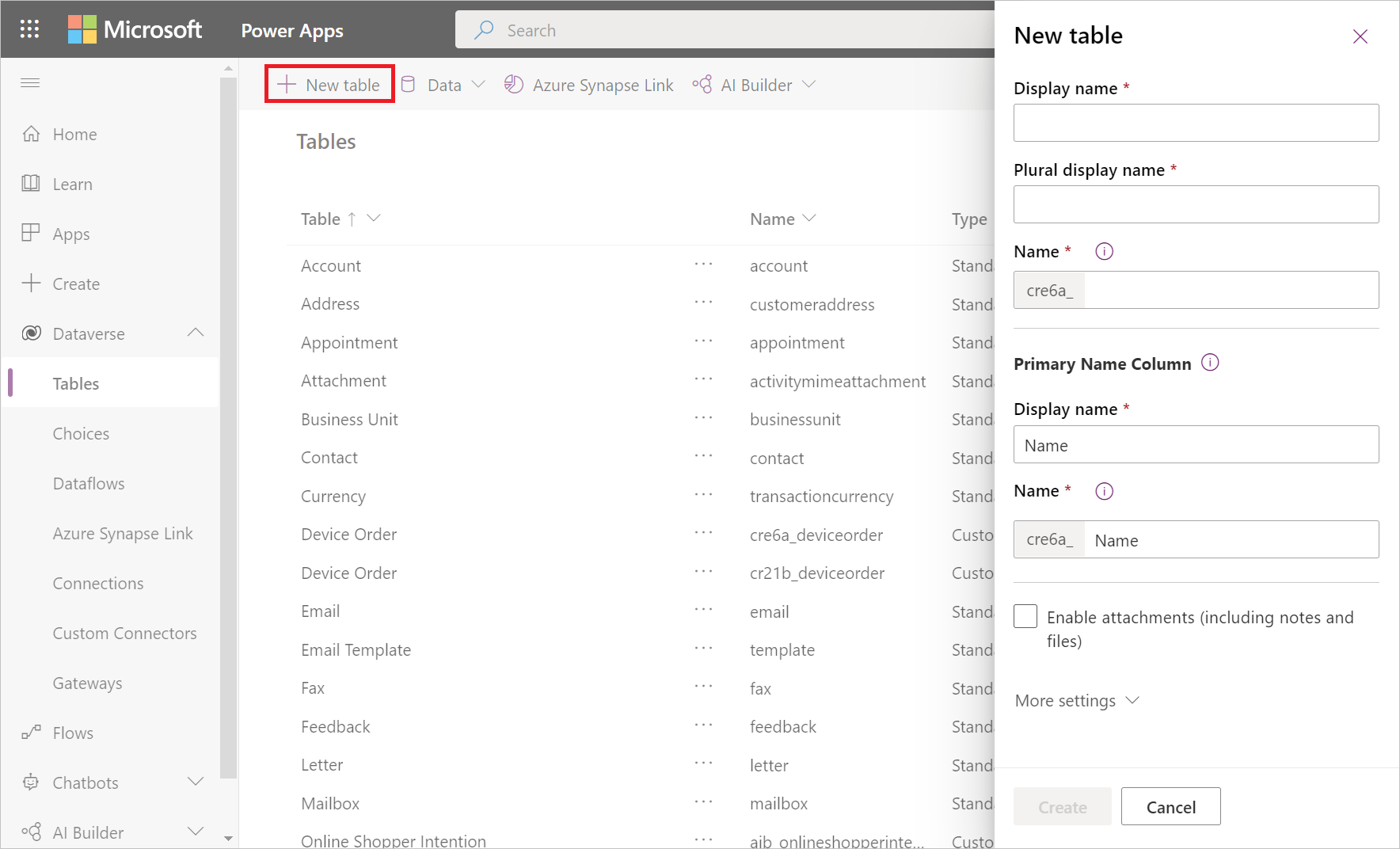 On the left navigation pane expand Data, select Tables, and then select New table.