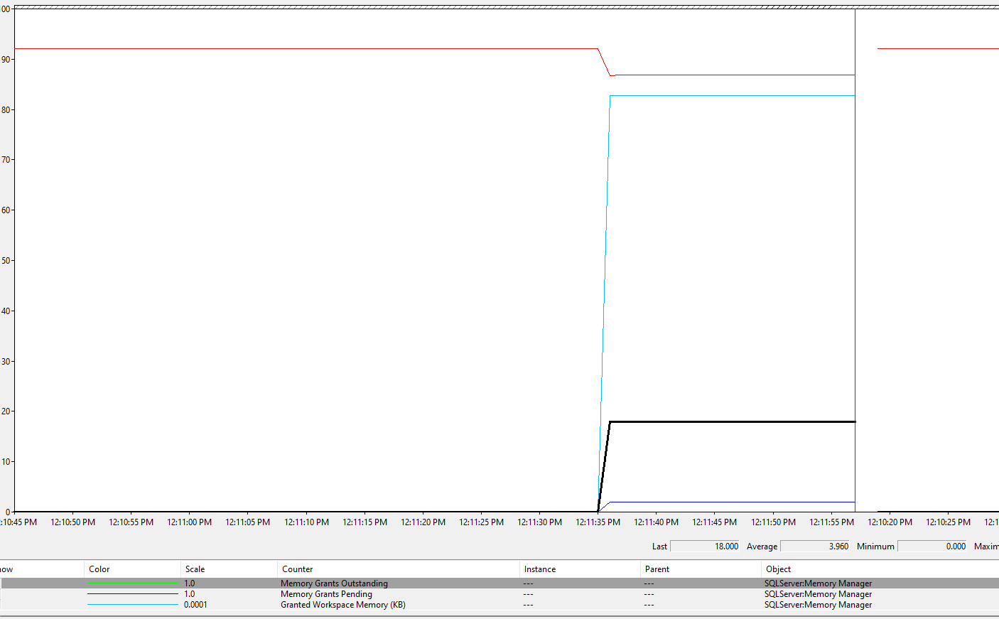 Similar information is available via Performance Monitor counters, where you can observe the currently granted requests (Memory Grants Outstanding), the waiting grant requests (Memory Grants Pending), and the amount of memory used by memory grants (Granted Workspace Memory (KB)). In the following picture, the outstanding grants are 18, the pending grants are 2, and the granted workspace memory is 828,288 KB. The Memory Grants Pending Perfmon counter with a nonzero value indicates that memory has been exhausted.