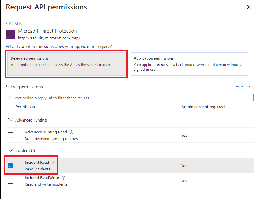 Choose Delegated permissions. Choose the relevant permissions for your scenario (for example Incident.Read), and then select Add permissions.