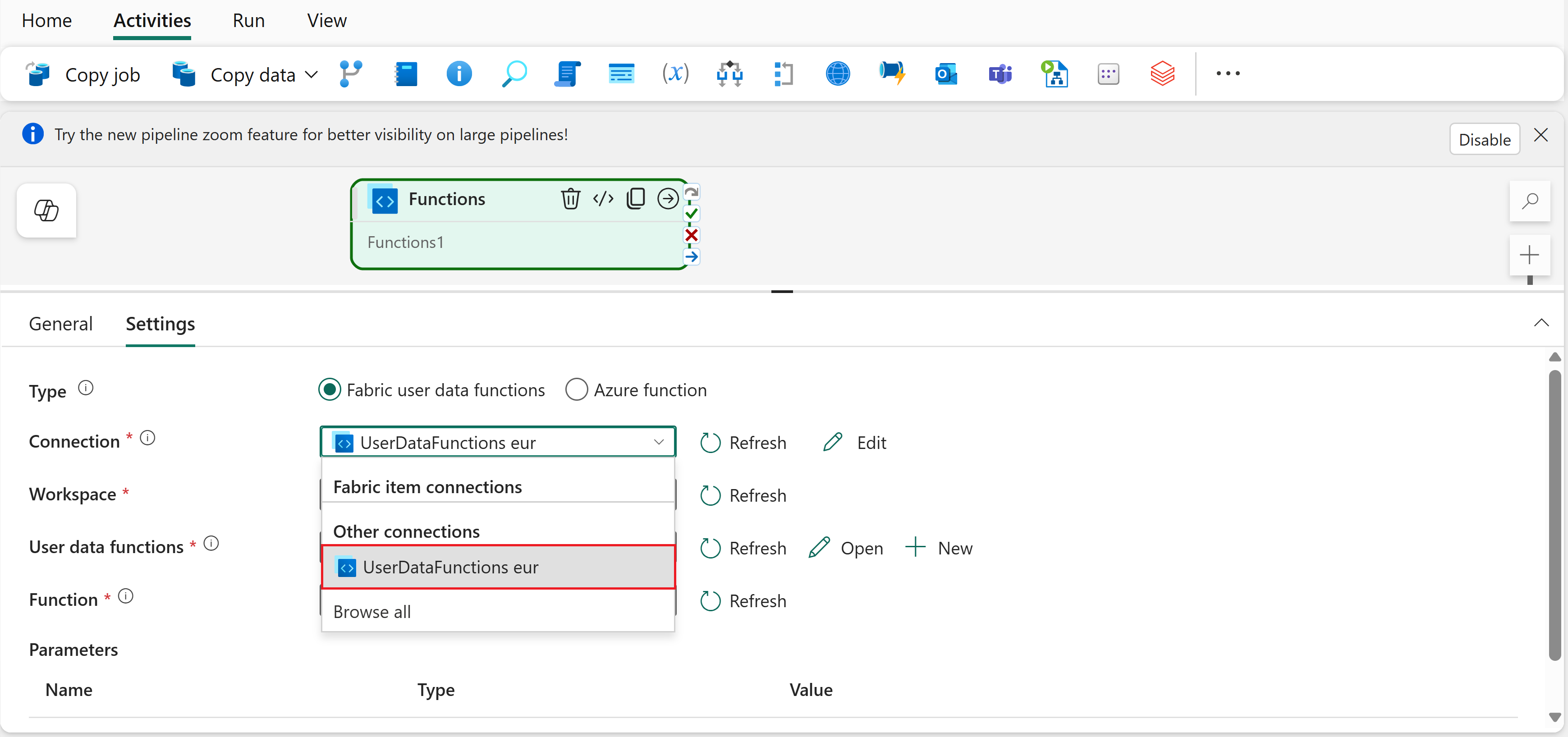 Back on the activity settings, select UserDataFunctions from the Connection dropdown. This is the connection you just created.