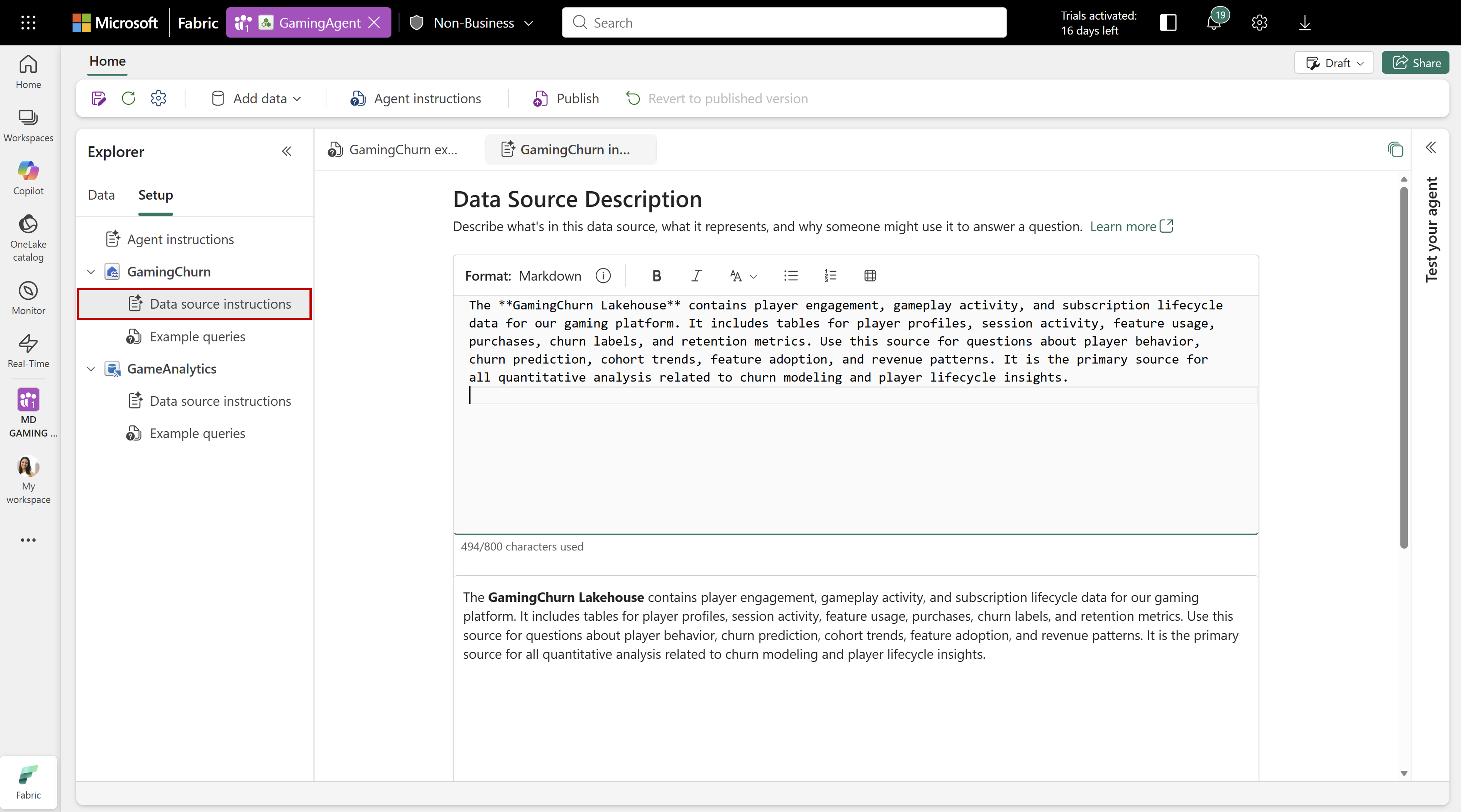// Example: "When asked about customers, use the 'ChurnModelScoring' Lakehouse to get customer details. Then, list any open support tickets"