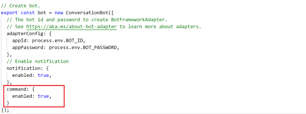 bot\src\internal\initialize.ts(js)and update yourconversationBotinitialization to enable the notification feature:To add command to your bot, follow the instructions in command bot in Teams.