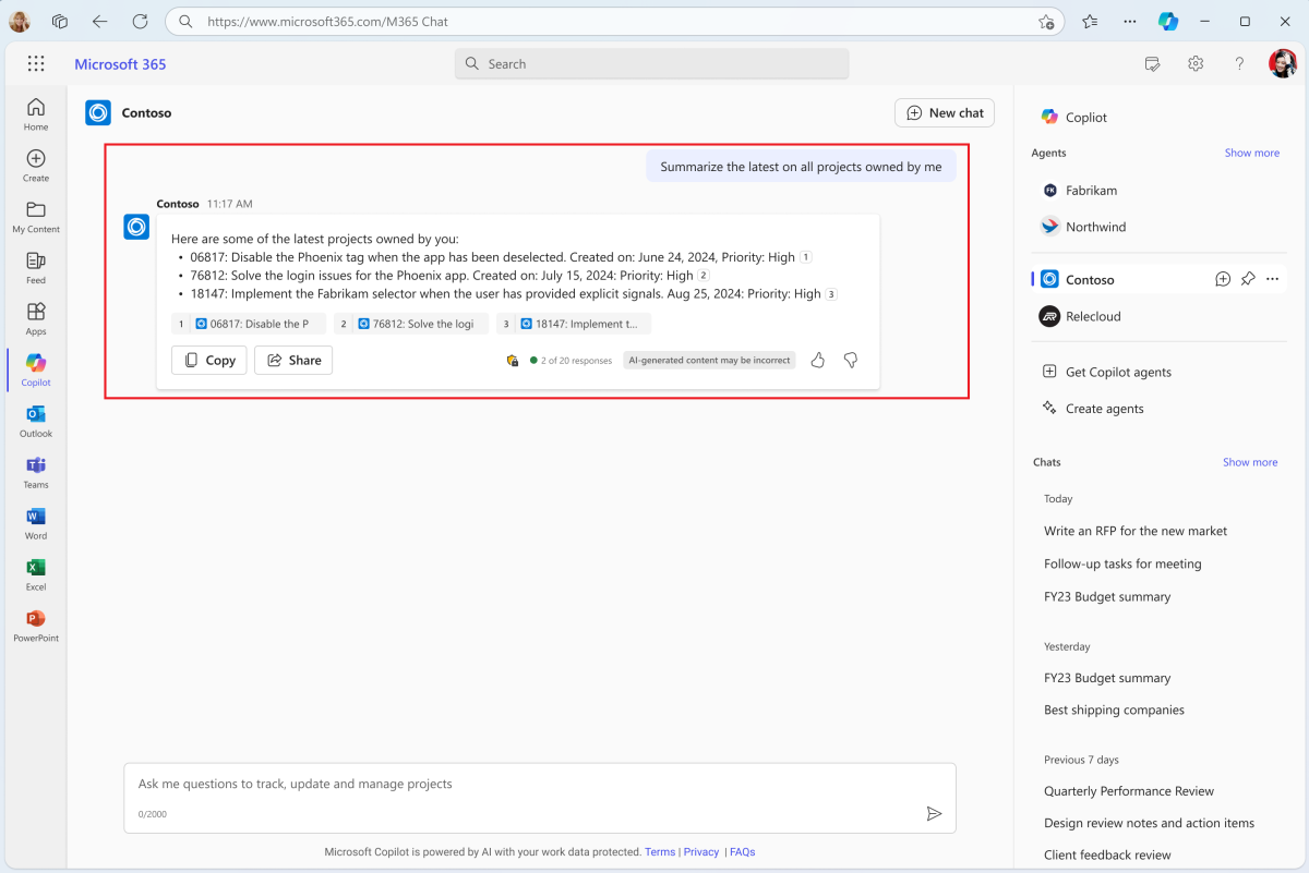This prompt might not always ensure a response from your message extension in Microsoft 365 Copilot. If this occurs, try different prompts or provide feedback by downvoting the Microsoft 365 Copilot response and leaving a message.