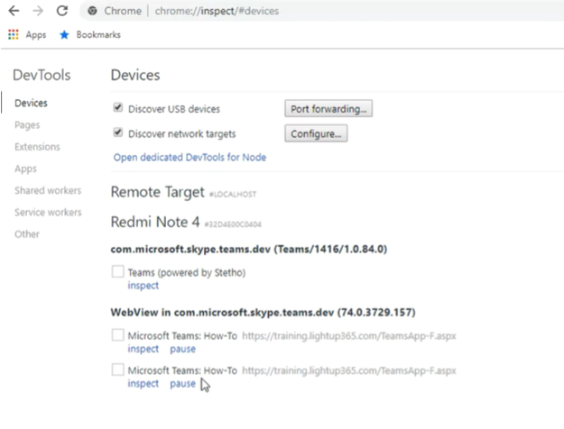 chrome://inspect/#devices.Select inspect under the tab you wish to debug, as in the following image: