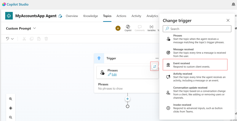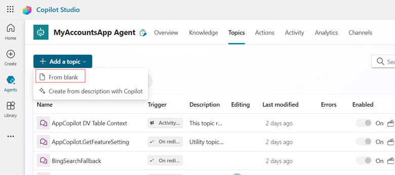 Buka ejen yang menyokong apl dan Copilot Studio tambah topik kosong baharu.