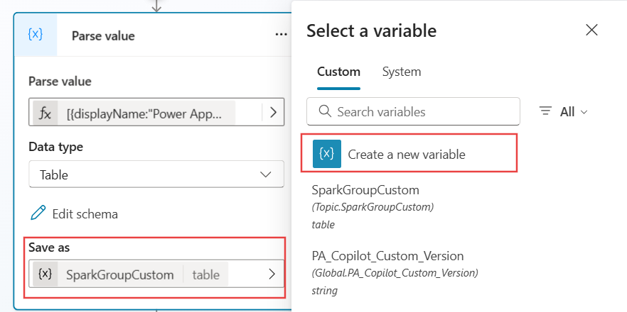 PA_Copilot_Sparks.sparkGroupsdan/atauGlobal.PA_Copilot_Sparks.sparks. Ini mengisi flyout dengan gesaan anda. Seterusnya, tambah langkah untuk menetapkan nilai pembolehubah.Cari nama takrifan percikan api daripada langkah sebelumnya, seperti