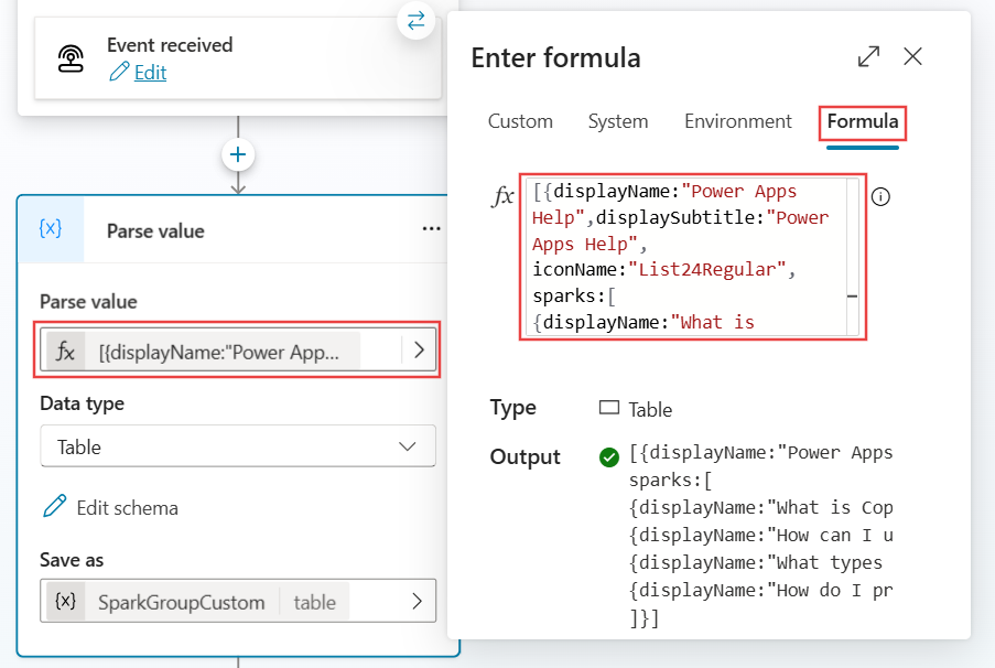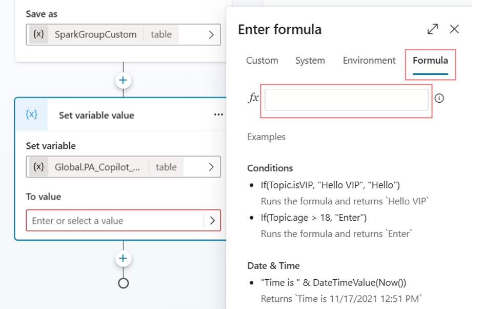 Global.PA_Copilot_Sparks.sparkGroups, dan tetapkan nilai kepada fungsi gabungan berikut Power Fx .ForAll(Sequence(CountRows(Global.PA_Copilot_Sparks.sparkGroups)+CountRows(Topic.SparkGroupCustom)), If(Value<=CountRows(Global.PA_Copilot_Sparks.sparkGroups),Index (Global.PA_Copilot_Sparks.sparkGroups,Value), Index(Topic.SparkGroupCustom, Value - CountRows(Global.PA_Copilot_Sparks.sparkGroups))))Gantikan nama pemboleh ubah dengan nama pemboleh ubah yang anda gunakan untuk gesaan tersuai, yang dalam contoh ini ialah SparkGroupCustom.