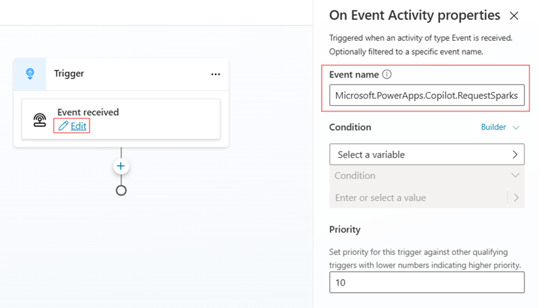 condition:Global.PA__Copilot_Model_PageContext.pageContext.entityTypeName = "Entity name"Di bawah Keutamaan, tambah nilai keutamaan yang sesuai supaya pencetus diaktifkan selepas topik keutamaan yang lebih tinggi. Nilai keutamaan boleh mempunyai julat 0 hingga 10K dengan 0 adalah yang tertinggi. Walaupun kira-kira 200 disyorkan kerana ia membolehkan lebih banyak pilihan untuk menambah topik keutamaan yang lebih tinggi kemudian, 10 digunakan dalam contoh ini.