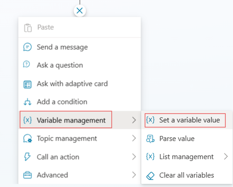 Pilih + di bawah langkah Parse nilai , dan kemudian pilih Pengurusan pemboleh>ubah Tetapkan nilai pemboleh ubah.