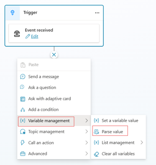 Pilih + di bawah Peristiwa diterima, dan kemudian pilih Nilai penghuraian>pengurusan pemboleh ubah untuk menambah langkah seterusnya untuk nilai penghuraian pengurusan pembolehubah.