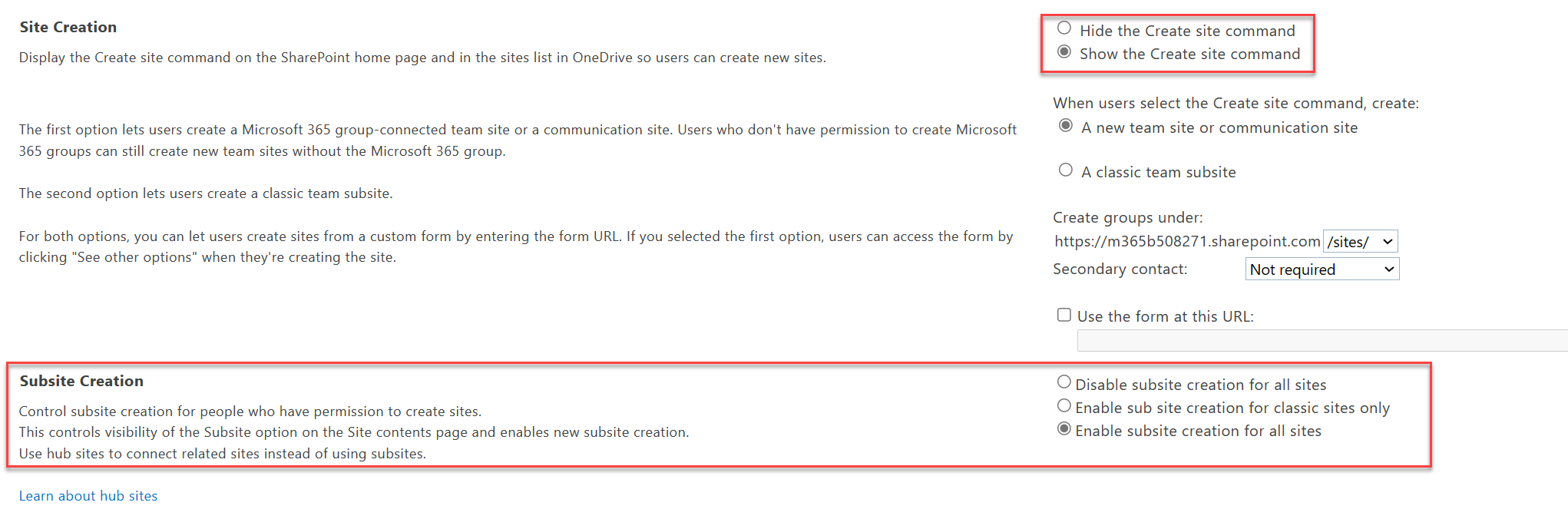 - If you choose Disable subsite creation for all sites, it hides the subsite creation command (including classic) and disable users from being able to create new subsites through a URL or API.
