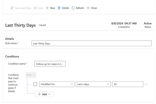 Another component is rules. These rules help to determine which cases are eligible for case following up. By default, there is a last thirty days rule, however you can create additional rules as needed.