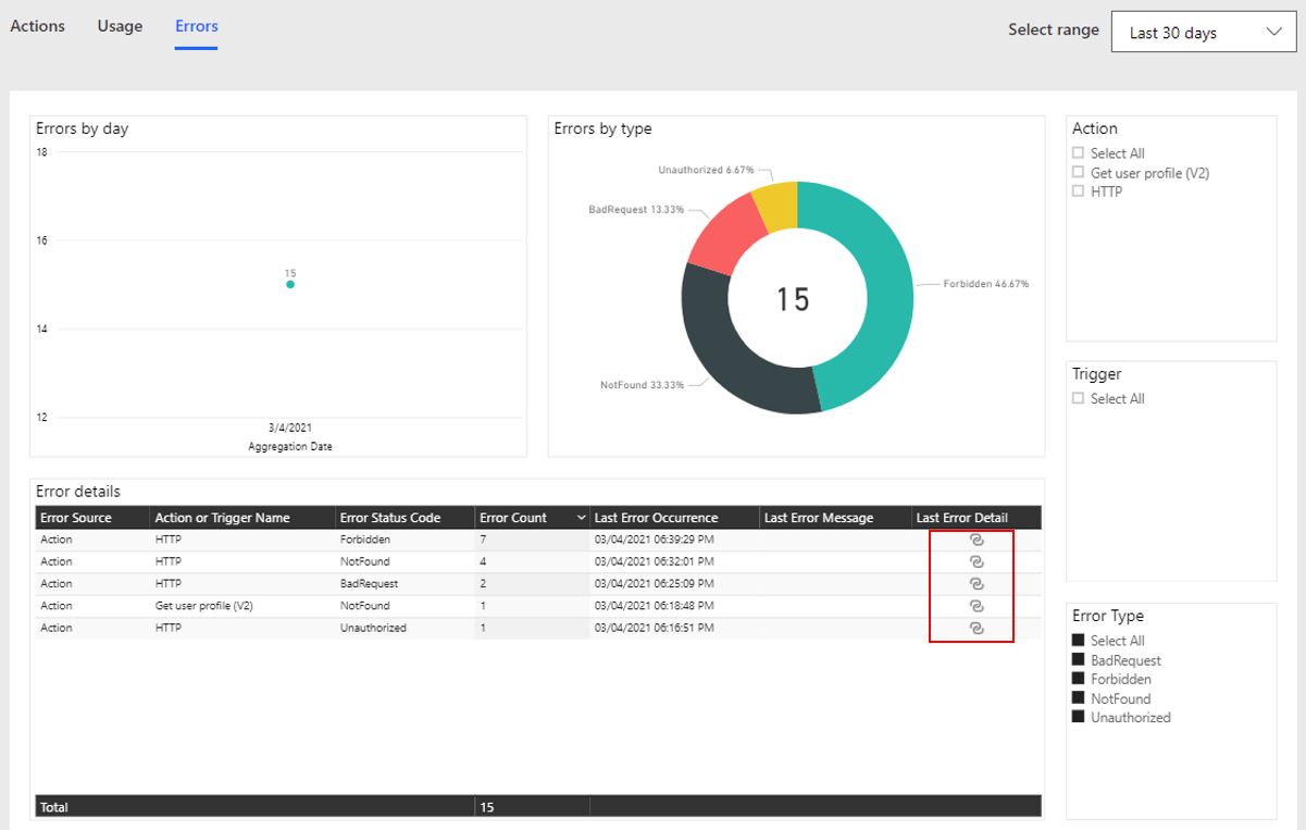 The preceding screenshot shows the Last Error Detail column in the Error details table. Hovering over the column provides you with a direct link to the failed run and its details.