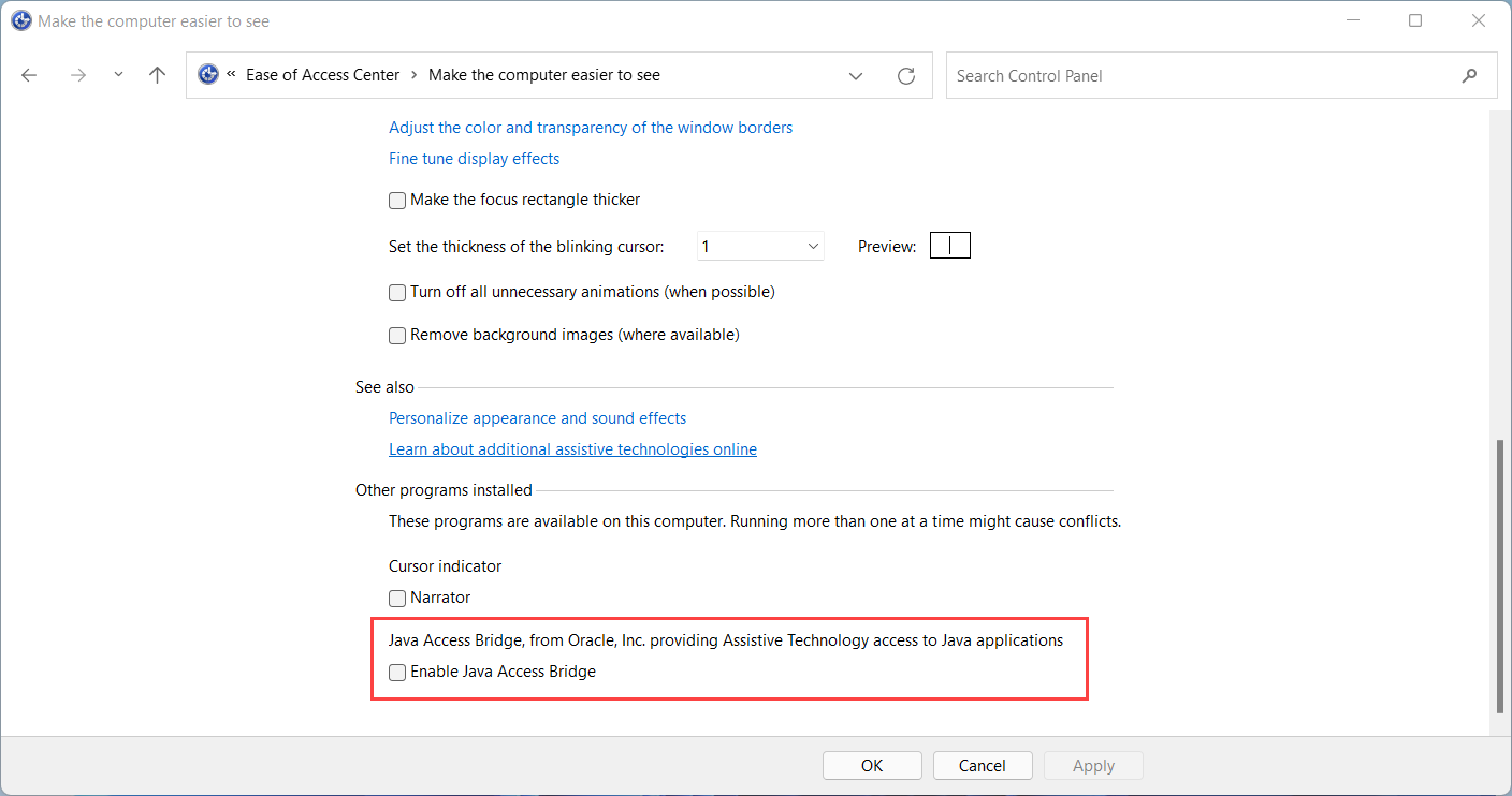 Go to Control Panel > Ease of Access > Optimize visual display > Java Access Bridge from Oracle, Inc. Providing Assistive Technology access to Java applications, and then disable the Enable Java Access Bridge option.