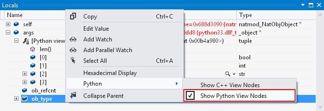 When a native (C or C++) frame is active, its local variables show up in the debugger Locals window. In native Python extension modules, many of these variables are of type PyObject (which is a typedef for _object), or a few other fundamental Python types. In mixed-mode debugging, these values present another child node labeled [Python view].