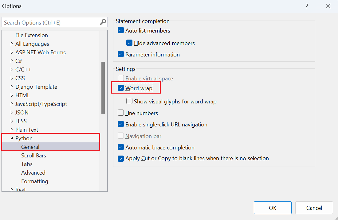 Screenshot that shows how to enable word wrapping for Python in Visual Studio.