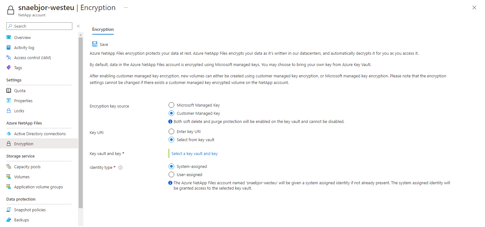 - If you choose System-assigned, select the Save button. The Azure portal configures the NetApp account automatically by adding a system-assigned identity to your NetApp account. An access policy is also created on your Azure Key Vault with key permissions Get, Encrypt, Decrypt.