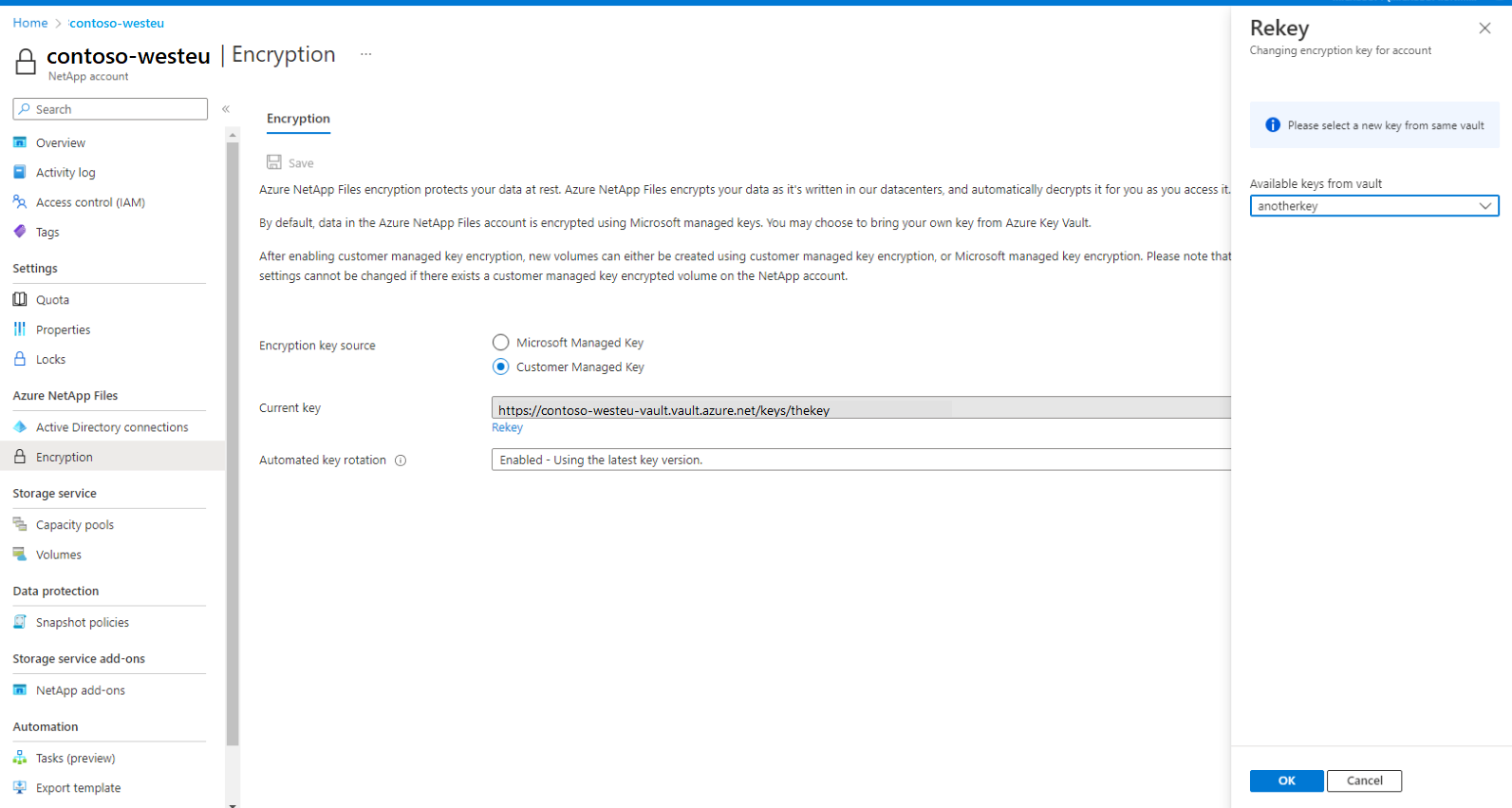 If you have already configured your NetApp account for customer-managed keys and have one or more volumes encrypted with customer-managed keys, you can change the key that is used to encrypt all volumes under the NetApp account. You can select any key that is in the same key vault. Changing key vaults isn't supported.