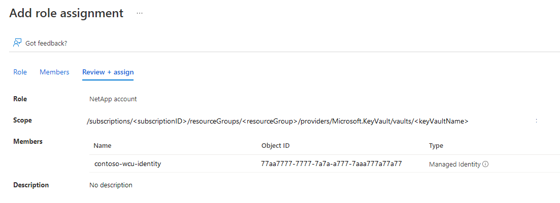 { "id": "/subscriptions/<subscription>/Microsoft.Authorization/roleDefinitions/<roleDefinitionsID>", "properties": { "roleName": "NetApp account", "description": "Has the necessary permissions for customer-managed key encryption: get key, encrypt and decrypt", "assignableScopes": [ "/subscriptions/<subscriptionID>/resourceGroups/<resourceGroup>" ], "permissions": [ { "actions": [], "notActions": [], "dataActions": [ "Microsoft.KeyVault/vaults/keys/read", "Microsoft.KeyVault/vaults/keys/encrypt/action", "Microsoft.KeyVault/vaults/keys/decrypt/action" ], "notDataActions": [] } ] } }Once the custom role is created and available to use with the key vault, you apply it to the user-assigned identity.
