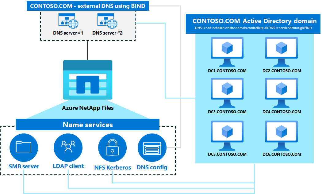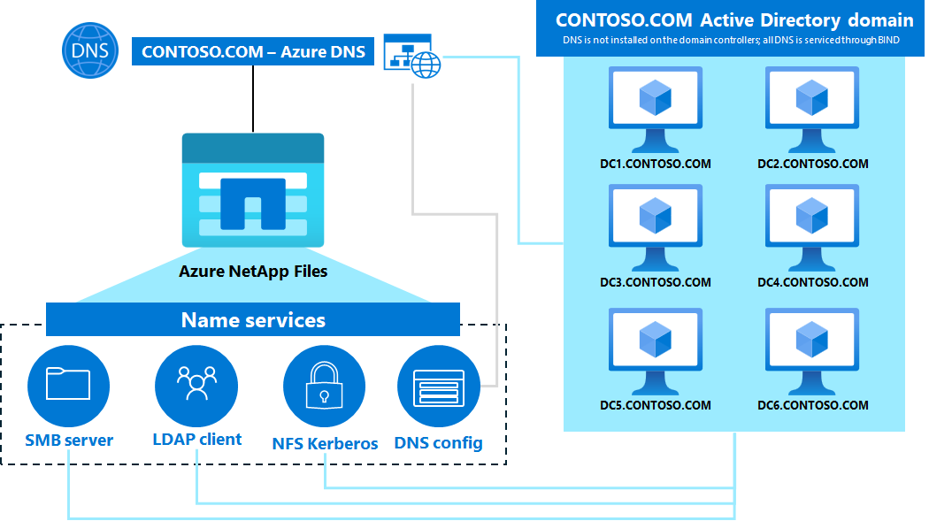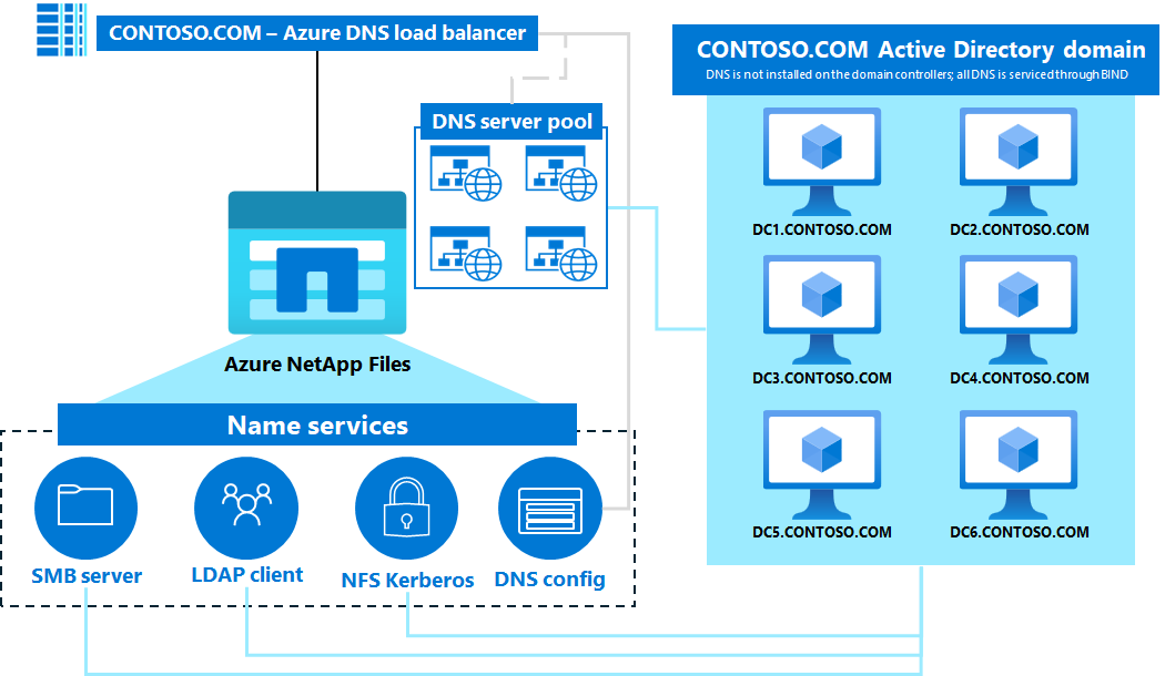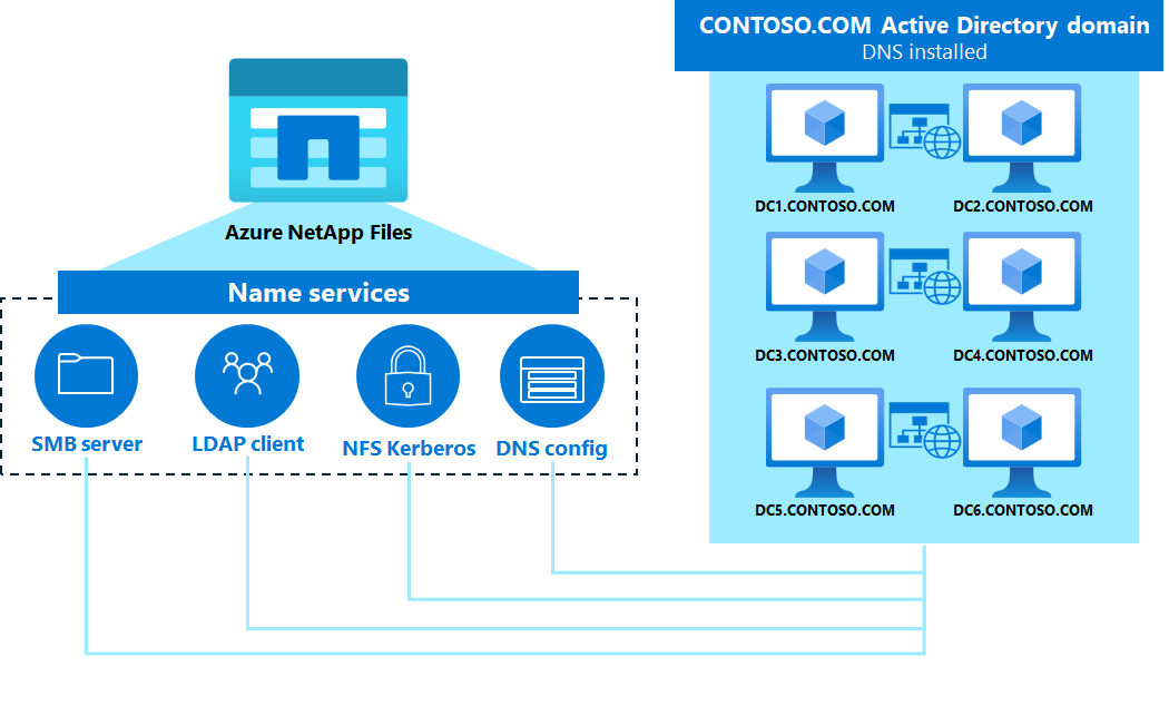 Azure NetApp Files requires an Active Directory connection for SMB and NFSv4.1 Kerberos functionality. Active Directory requires DNS for proper functionality. In most cases, Active Directory deployments are installed with DNS servers integrated with the domain controllers. This configuration is a Microsoft best practice for both ease of use and to ensure all required DNS records are created for domain services.