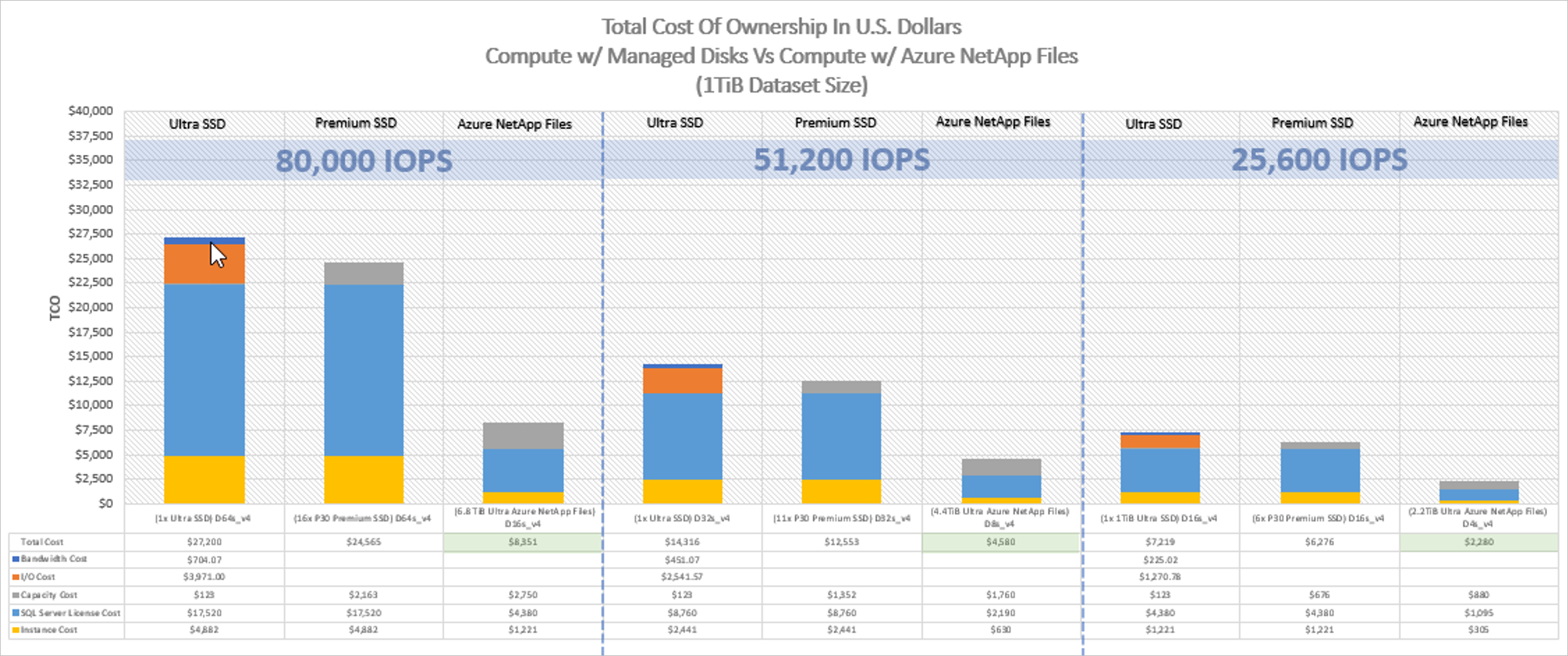 This article shows a detailed cost analysis and performance benefits about using Azure NetApp Files for SQL Server deployment. Not only do smaller instances have sufficient CPU to do the database work only possible with block on larger instances, in many cases, the smaller instances are even more performant than their larger, disk-based counterparts because of Azure NetApp Files.