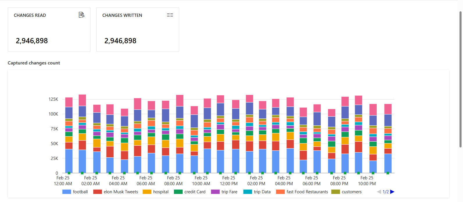 If you set up multiple mappings in your change data capture, each mapping appears as a different color. Select the bar to see specific details for each mapping, or use the diagnostics information at the bottom of the pane.