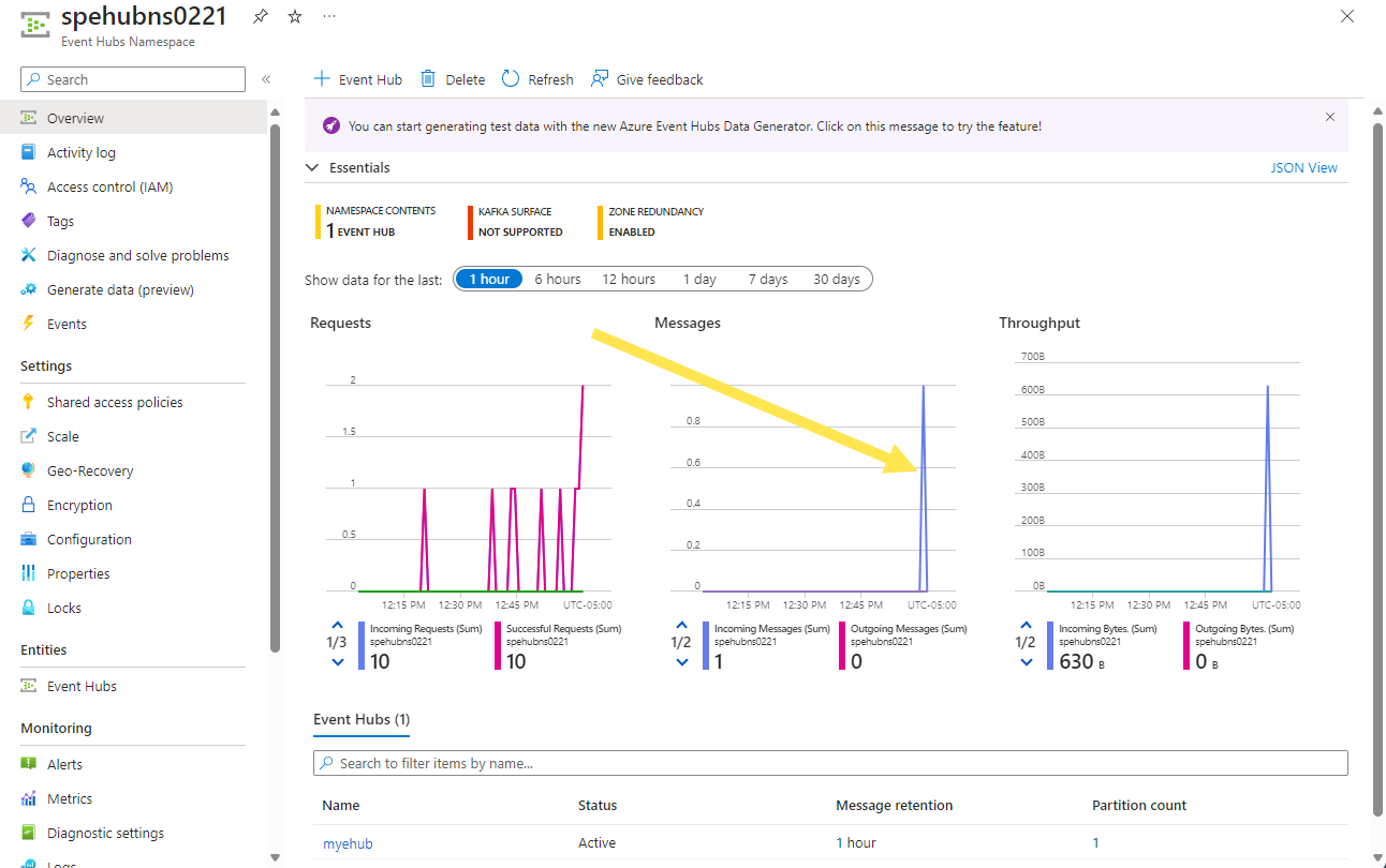 curl -X POST -H "Content-Type: application/cloudevents+json" -H "Authorization:SharedAccessKey $key" -d "$event" $publish_operation_uriNavigate to the Event Hubs Namespace page in the Azure portal, refresh the page and verify that incoming messages counter in the chart indicates that an event has been received.