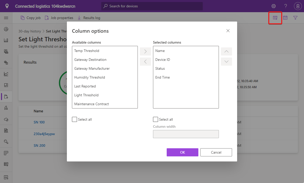 Use the Column options dialog box to choose the device list columns. Select the columns that you want to display, select the right arrow, and then select OK. To select all the available columns, choose Select all. The selected columns appear in the device list.