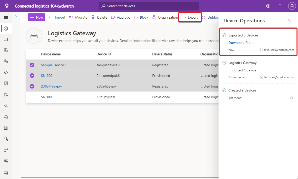 To connect a real device to IoT Central, you need its connection string. You can export device details in bulk to get the information you need to create device connection strings. The export process creates a CSV file with the device identity, device name, and keys for all the selected devices.