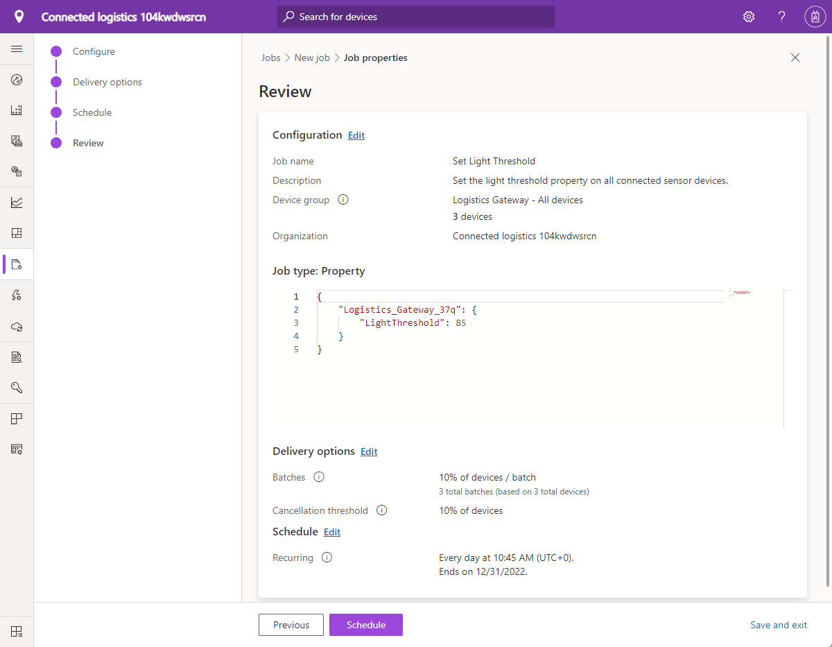 Select Next to move to the Review page. The Review page shows the job configuration details. Select Schedule to schedule the job: