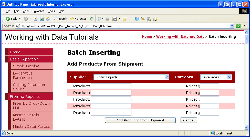 In this tutorial we will create a page that implements the batch inserting interface shown in Figure 1. As with the previous two tutorials, we will wrap the insertions within the scope of a transaction to ensure atomicity. Let s get started!
