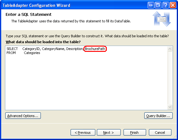 To update the main TableAdapter query, right-click on the CategoriesTableAdapter s header and choose the Configure option from the context menu. This brings up the Table Adapter Configuration Wizard, which we ve seen in a number of past tutorials. Update the query to bring back the BrochurePath and click Finish.