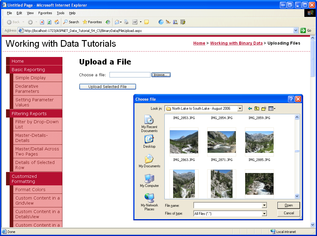 Figure 13 shows this page when viewed through a browser. Note that clicking the Browse button brings up a file selection dialog box, allowing the user to pick a file from their computer. Once a file has been selected, clicking the Upload Selected File button causes a postback that sends the selected file s binary content to the web server.