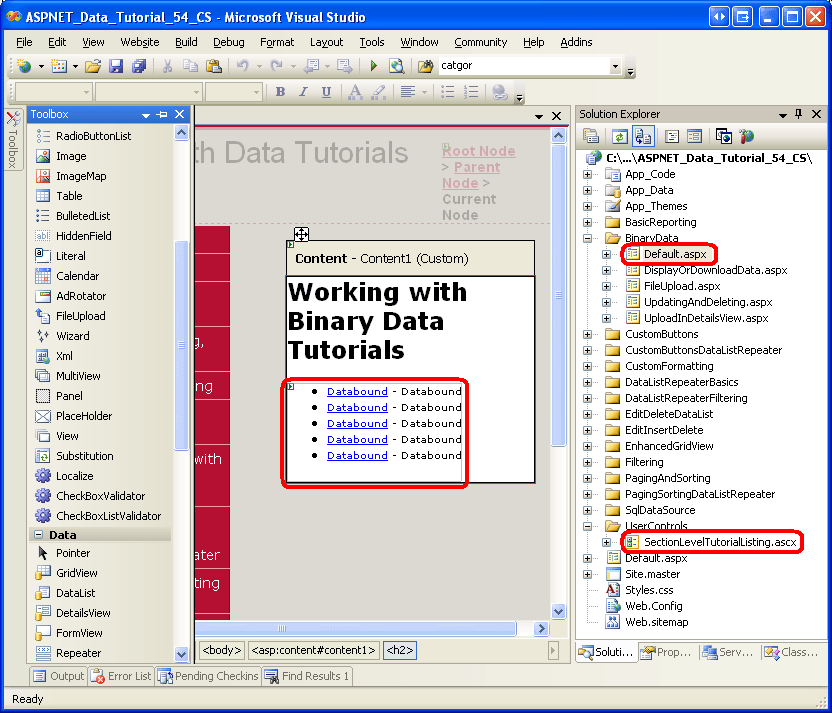 Like in the other folders, Default.aspx in the BinaryData folder will list the tutorials in its section. Recall that the SectionLevelTutorialListing.ascx User Control provides this functionality. Therefore, add this User Control to Default.aspx by dragging it from the Solution Explorer onto the page s Design view.