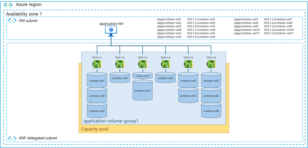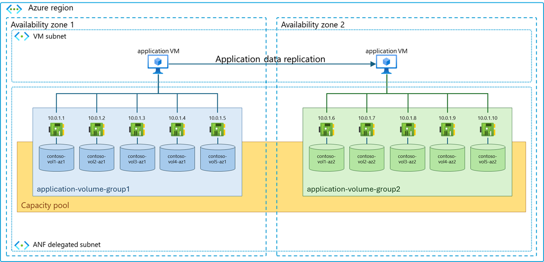 Volumes deployed by application volume group are placed in the regional or zonal infrastructure to achieve optimized latency and throughput for the application VMs.