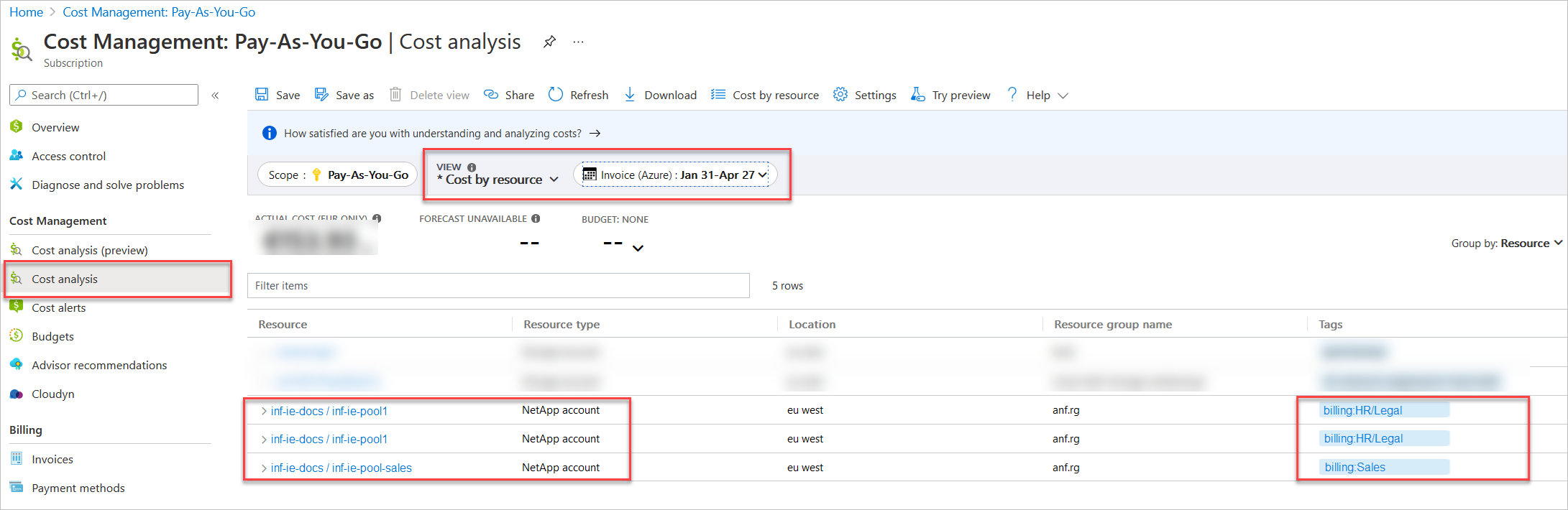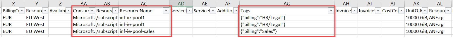Using tags helps you manage Azure NetApp Files billing and expenses. For example, your company might have only one Azure subscription but multiple departments that use Azure resources and incur expenses. You can tag the resources with the department names at the capacity pool level. The corresponding tags would be displayed in the bill to help you see the expense incurred by each department.