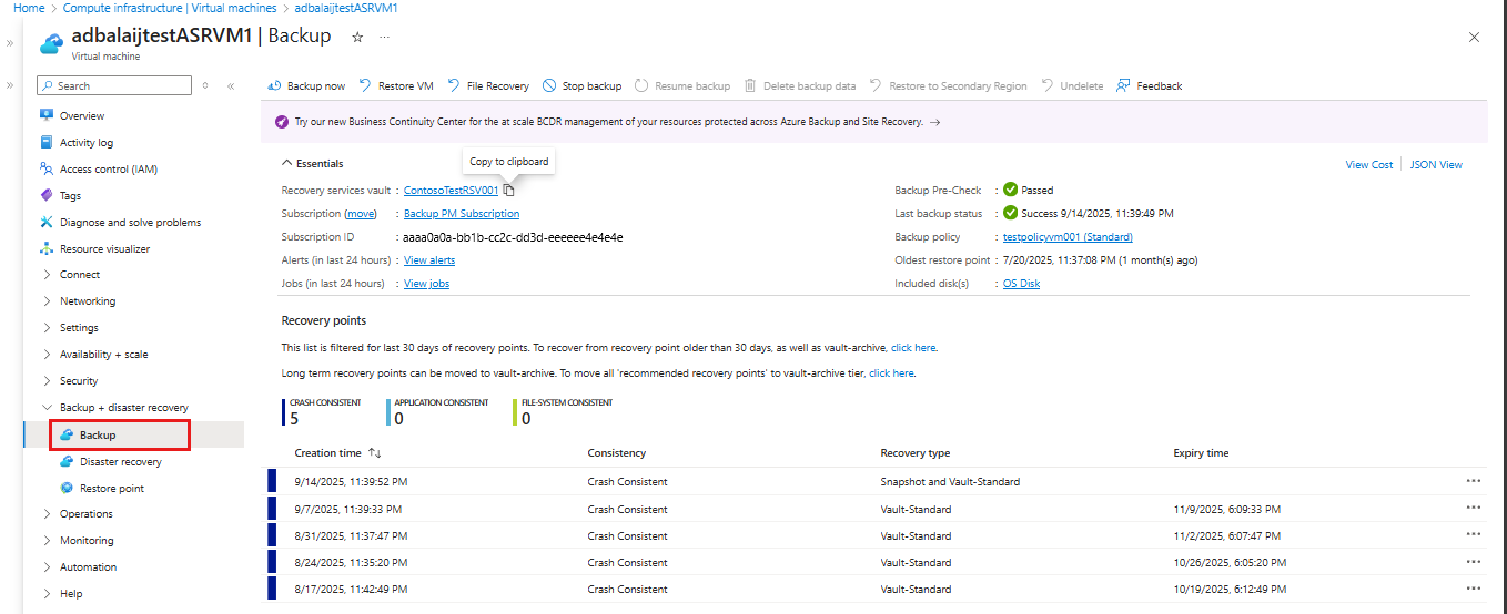 In the virtual machine's menu, select Backup to open the Backup dashboard.