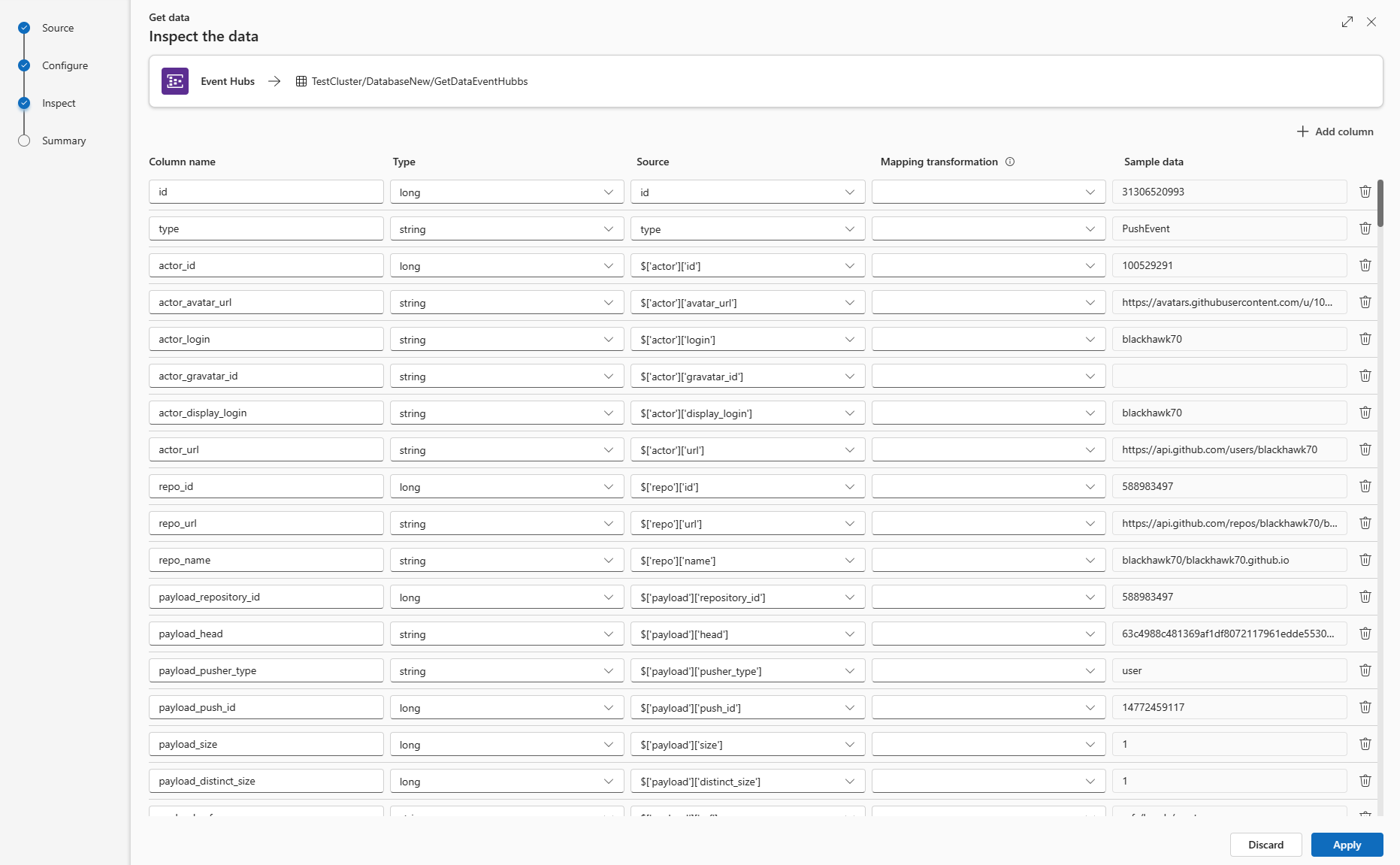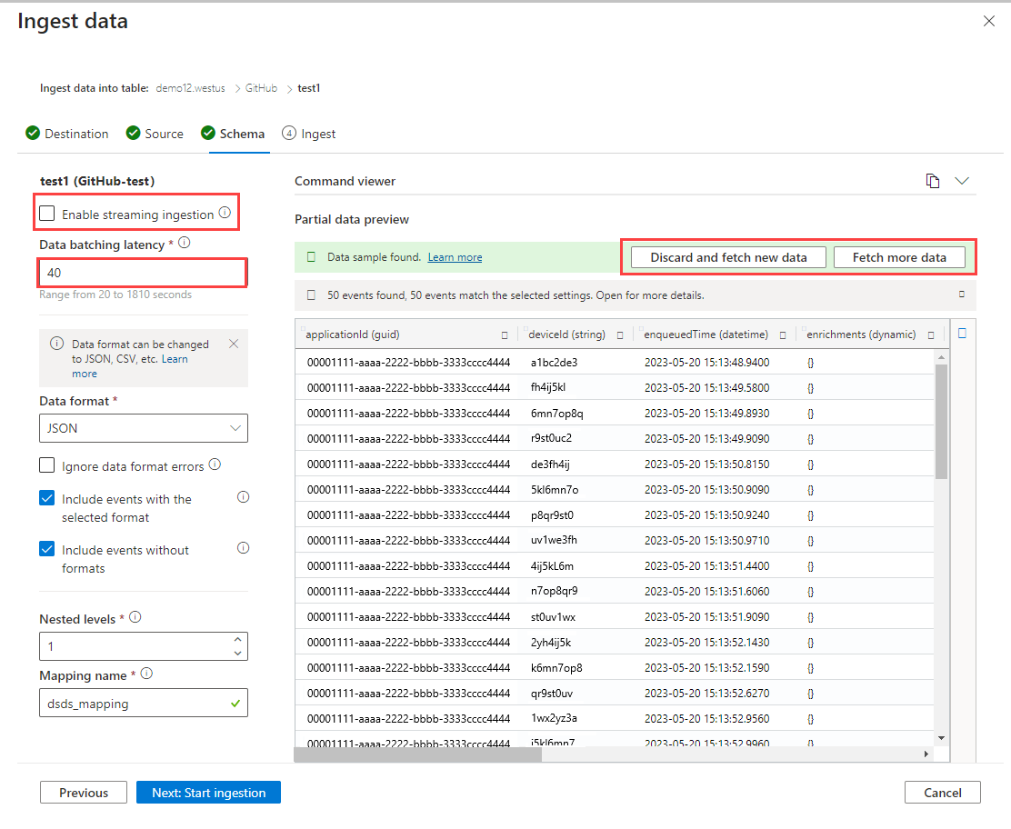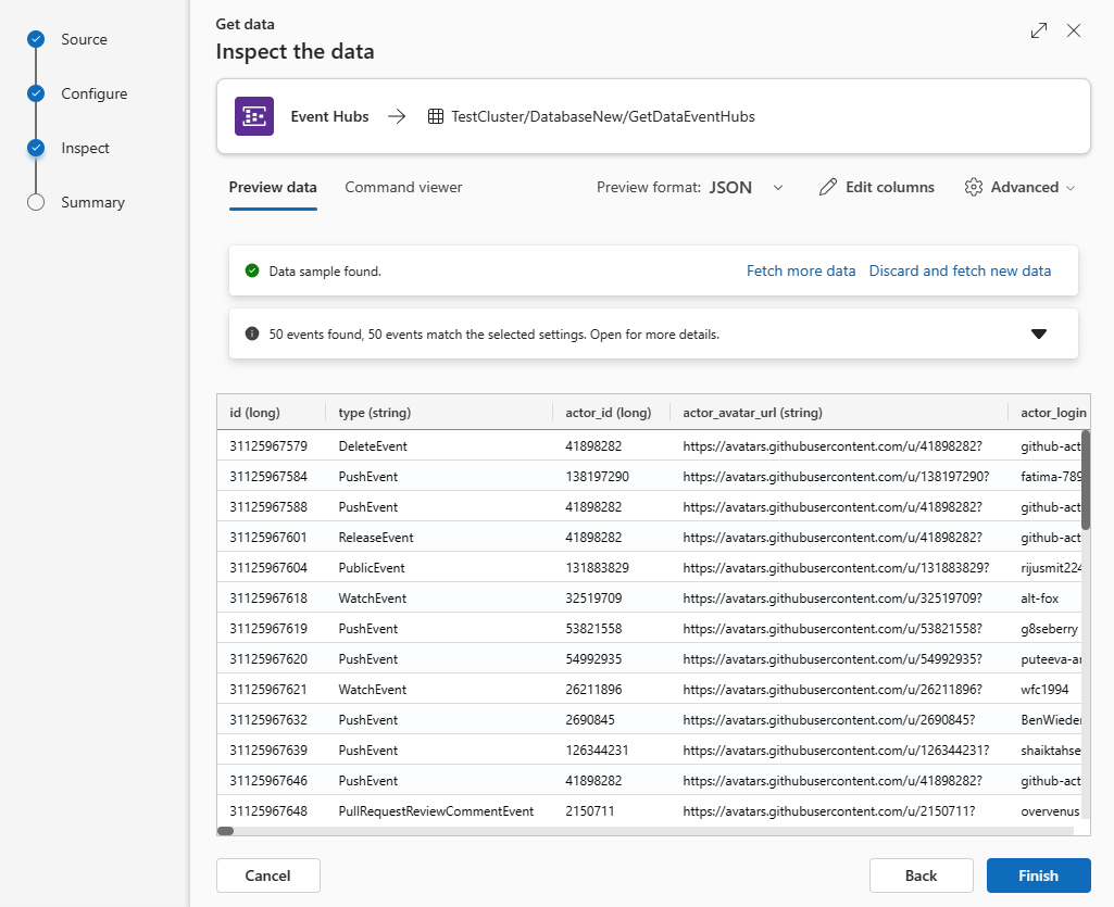If the data you see in the preview window isn't complete, you might need more data to create a table with all necessary data fields. Use the following commands to fetch new data from your event hub: