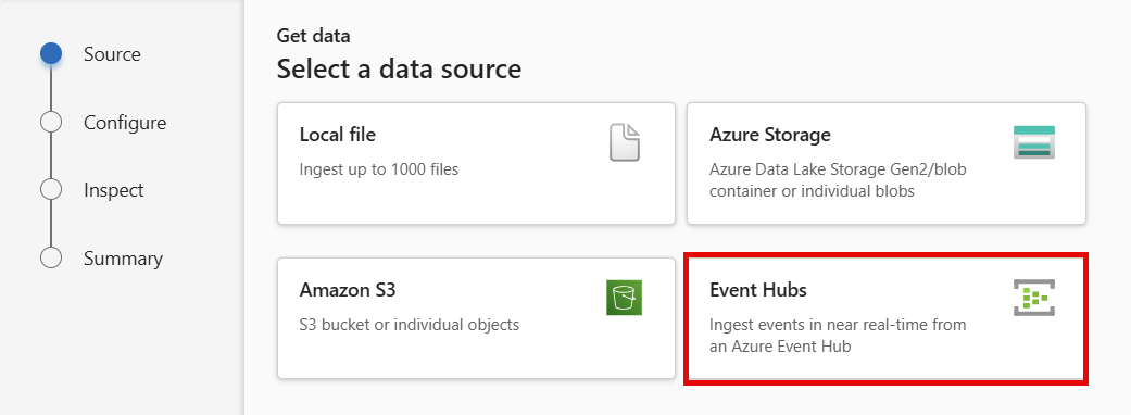 Select the data source from the available list. In this example, you're ingesting data from Event Hubs.