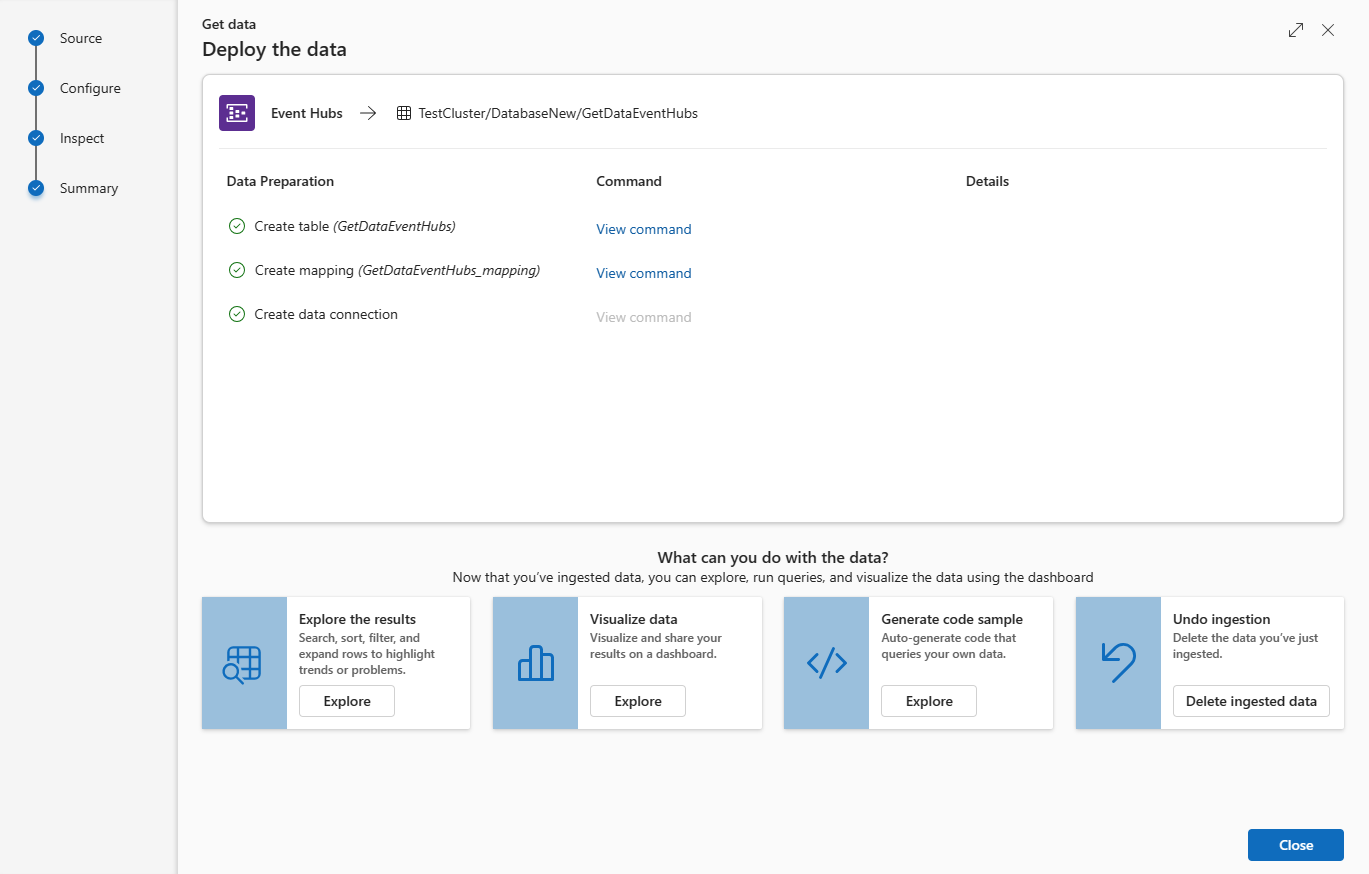 In the Data preparation window, all three steps are marked with green check marks when data ingestion finishes successfully. You can view the commands that were used for each step, or select a card to query, visualize, or drop the ingested data.