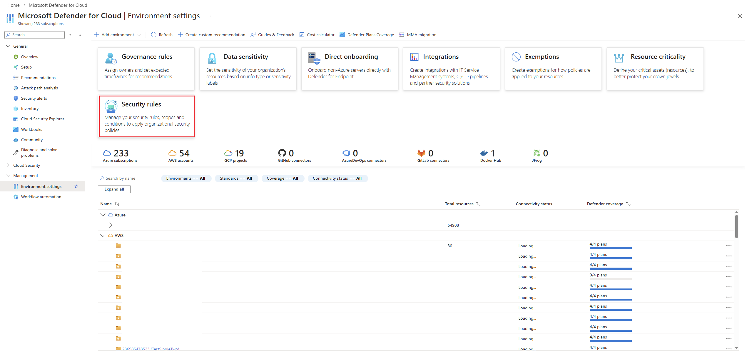 - Select Security Rules in the Microsoft Defender for Cloud Environment Settings pane.