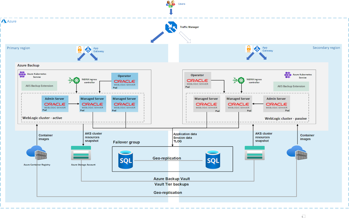 This tutorial shows you a straightforward and effective way to implement a business continuity and disaster recovery (DR) strategy for Java using Oracle WebLogic Server (WLS) on Azure Kubernetes Service (AKS). The solution illustrates how to back up and restore a WLS workload using a simple database-driven Jakarta EE application running on AKS. Geo-redundancy is a complex topic, with many possible solutions. The best solution depends on your unique requirements. For other ways to implement geo-redundancy, see the resources at the end of this article.