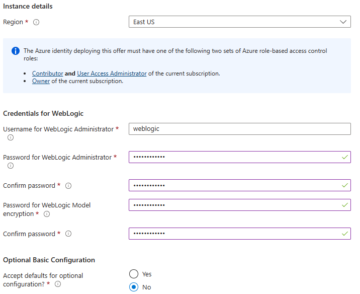In this section, you create a WLS cluster on AKS using the Oracle WebLogic Server on AKS offer. The cluster in East US is the primary and is configured as the active cluster.