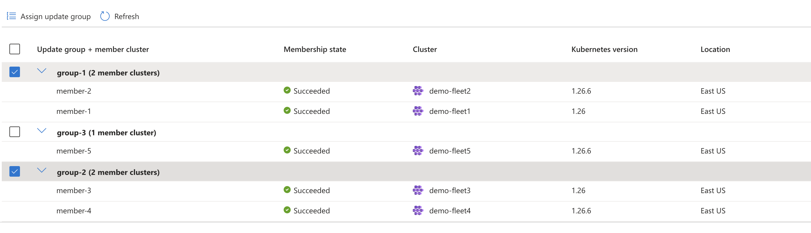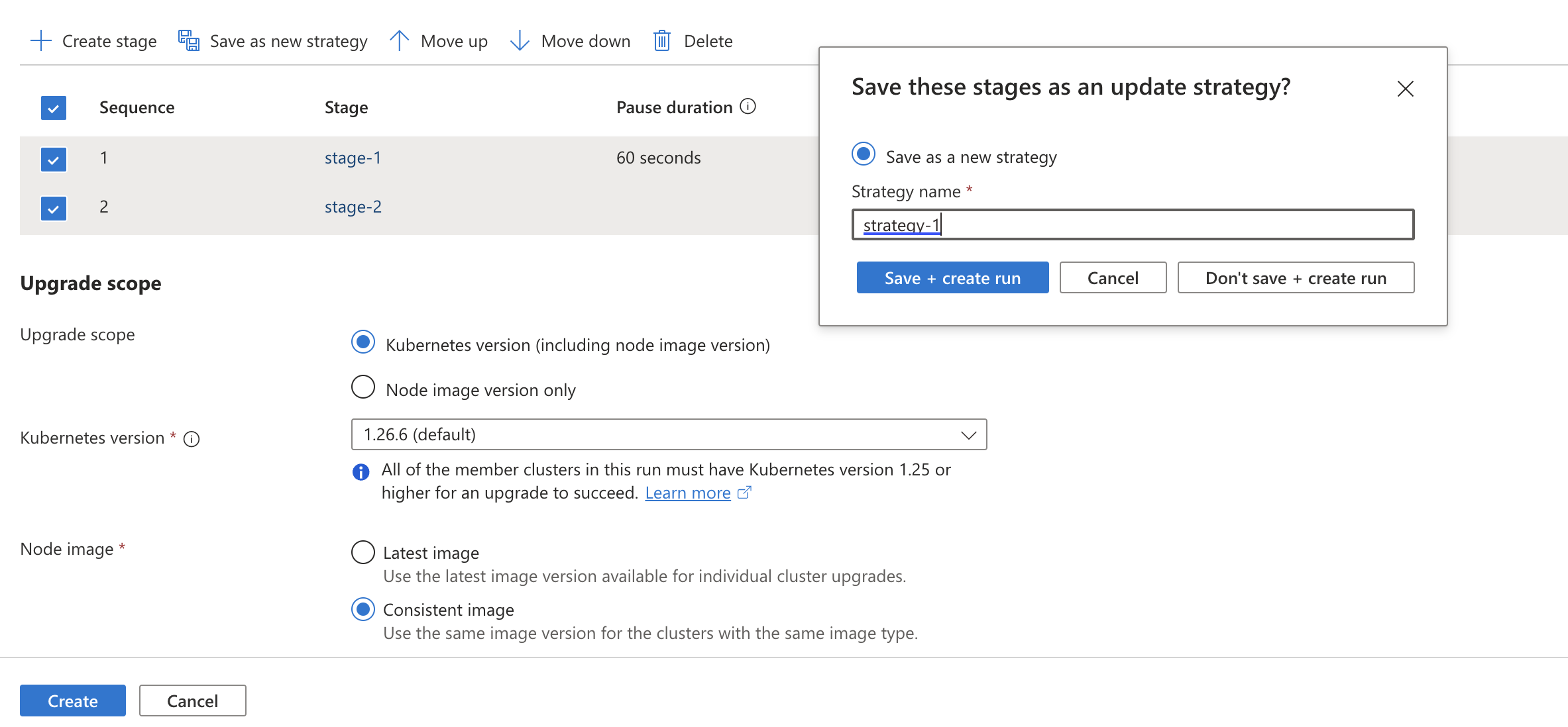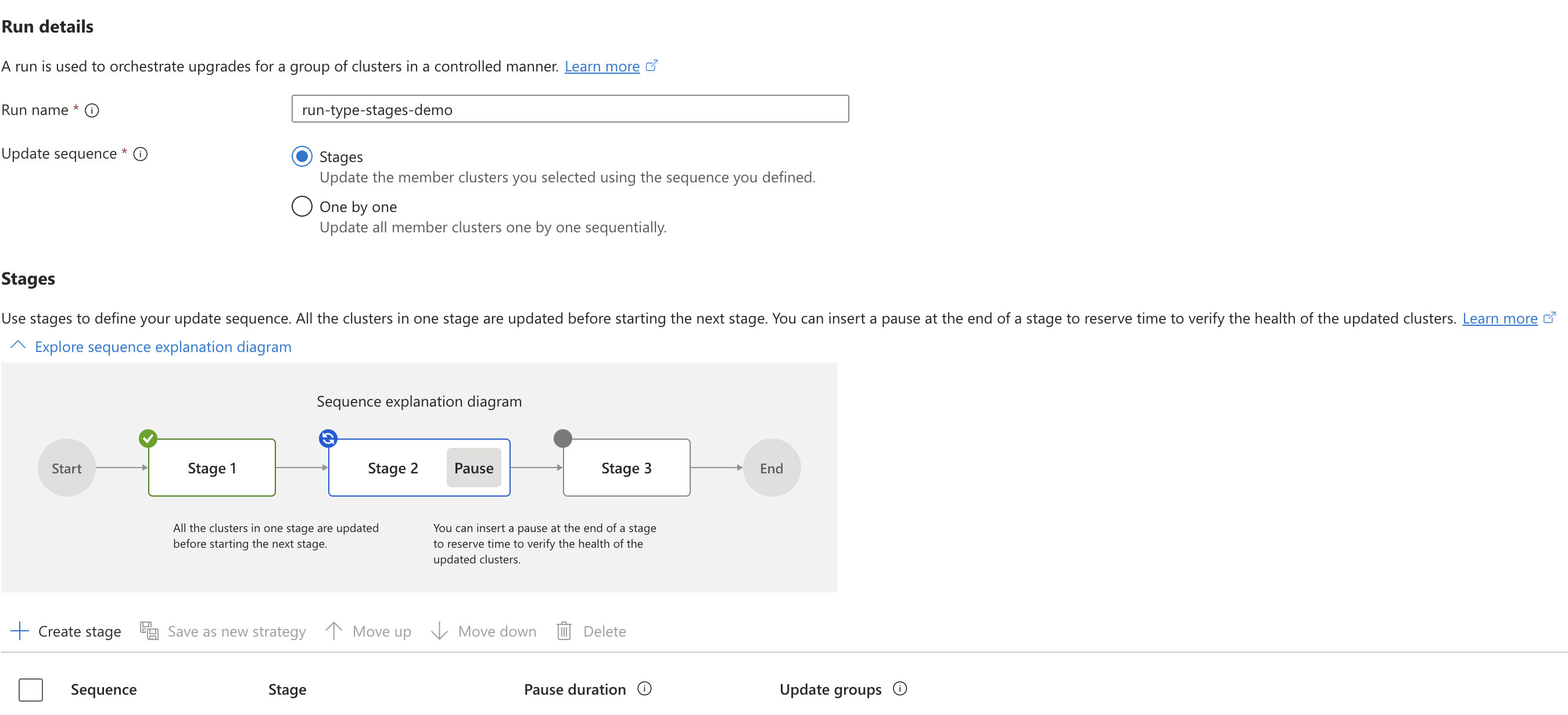 one-by-oneprovides a simple approach to upgrade all member clusters of the fleet in sequence one at a time. - Control sequence of clusters using update groups and stages: If you want to control the cluster upgrade sequence, you can structure member clusters in update groups and update stages. You can store this sequence as a template in the form of an update strategy. You can create update runs later using the update strategies instead of defining the sequence every time you need to create an update run.