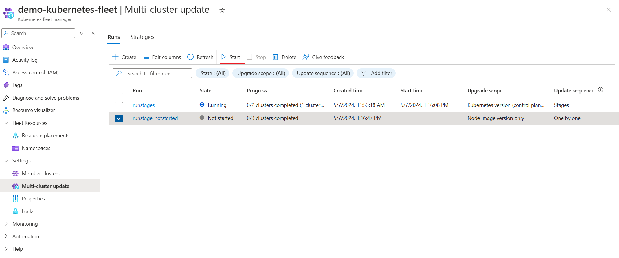 On the Multi-cluster update page of the fleet resource, you can Start an update run that's either in Not started or Failed state: