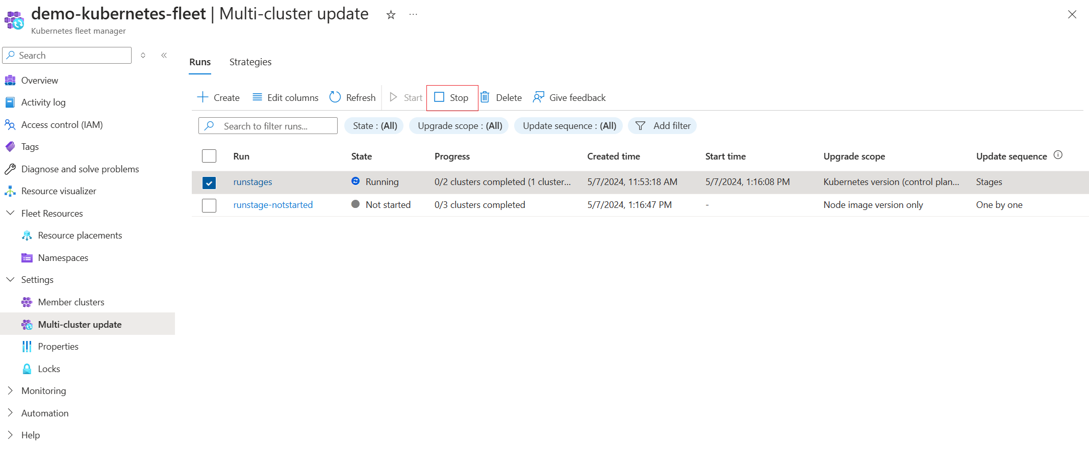 On the Multi-cluster update page of the fleet resource, you can Stop a currently Running or Pending update run: