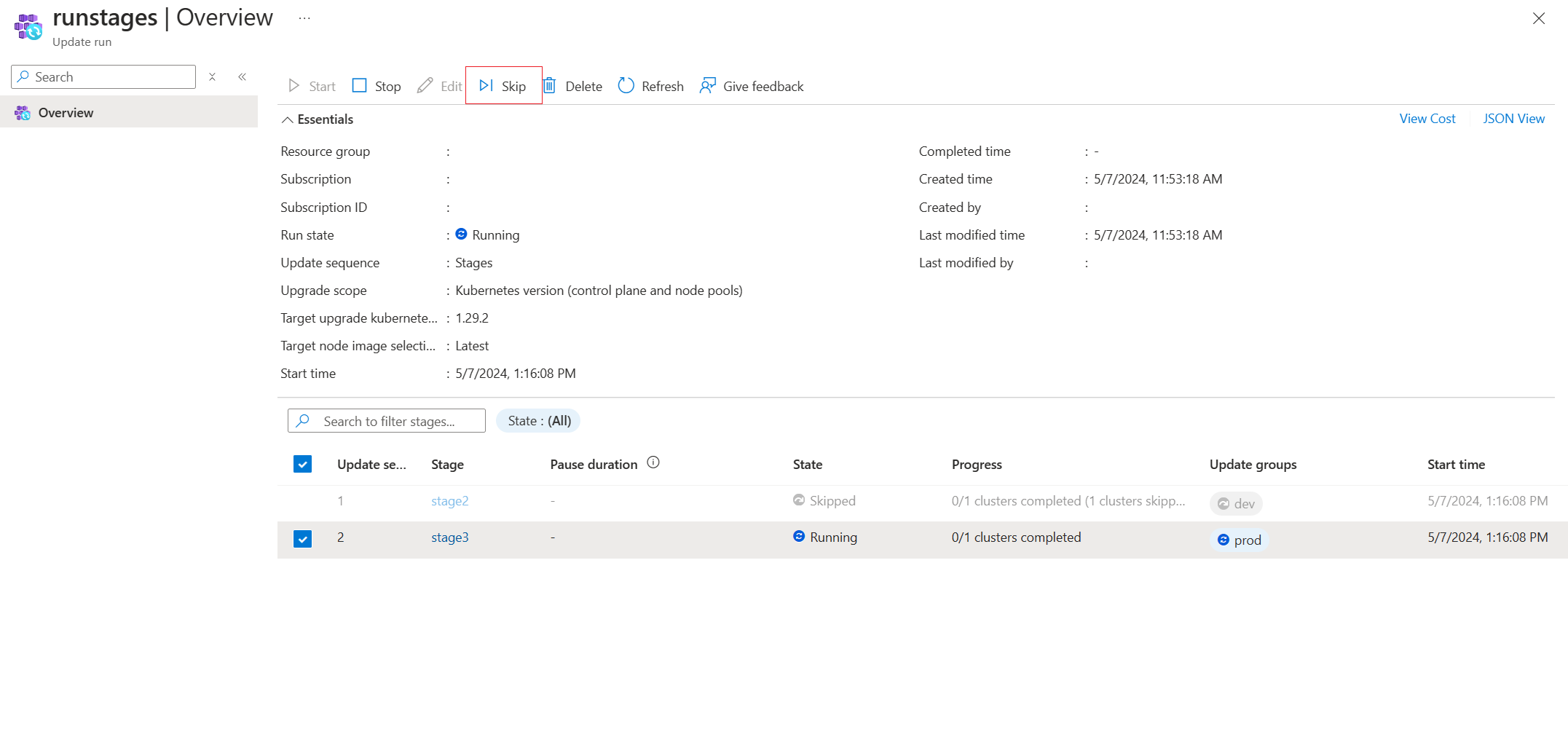 Within any update run in the Not Started, Failed, or Running state, you can select any Stage and Skip the upgrade:
