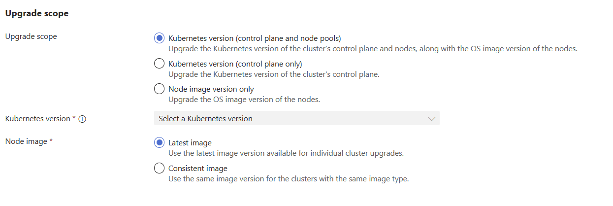 - Latest image: Updates every AKS cluster in the update run to the latest image available for that cluster in its region.
