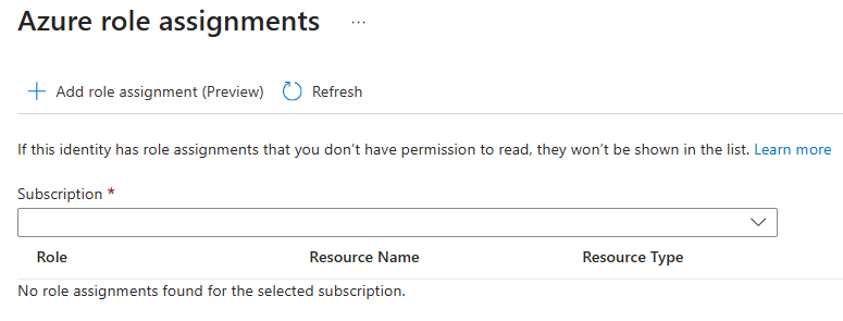 Select Azure role assignments tab in the managed identity resource's left navigation. This opens the Azure role assignments pane.